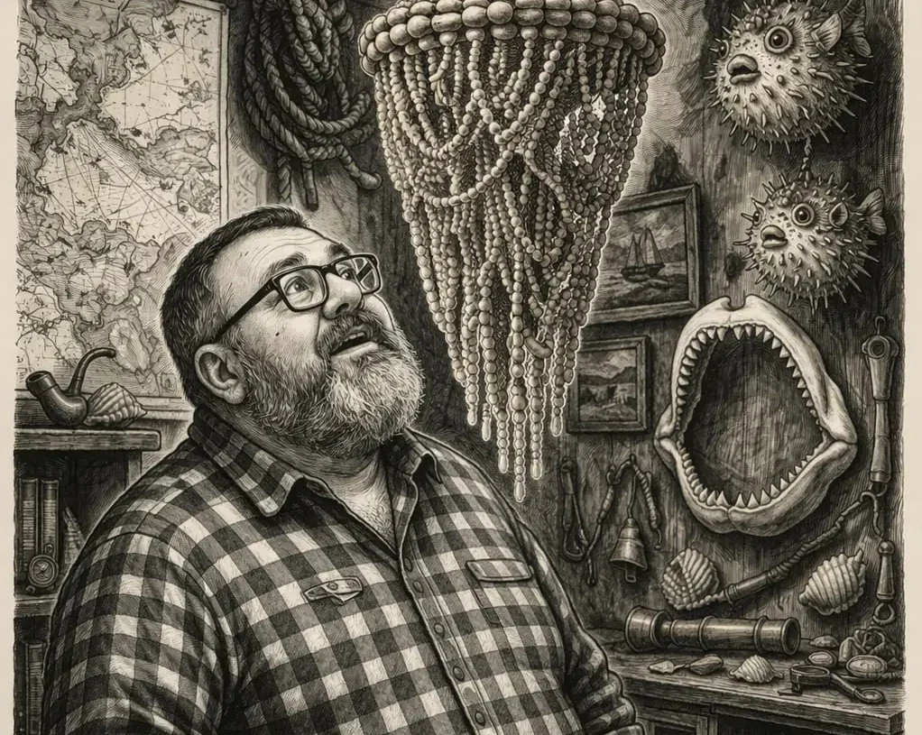 И тут меня накрыло. Потому что у меня тоже семья моряков. Я хорошо помню эти вещи: чучела рыбы-ежа с заклеенными шрамами, акульи челюсти, этот едва уловимый запах — рыба, клей, море. И ракушки. Из них делали шторы, светильники. Брали красивую ракушку, вставляли лампочку, прикручивали провод — иногда даже от утюга. Включаешь — и она светится мягким розовым светом.