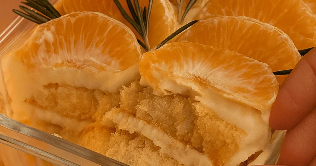 - Сверху выкладываем кусочки мандарина. По желанию добавляем веточки розмарина для аромата и стиля.