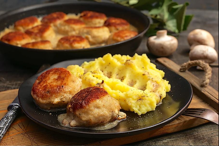 - Подавайте котлеты из трески с шампиньонами с картофельным пюре, полив соусом. Не менее вкусно будет и с макаронами.