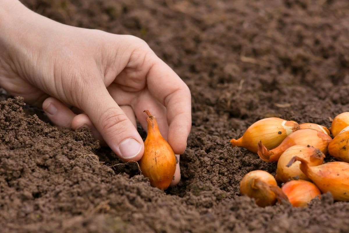 Затем сделайте бороздки глубиной около 5 сантиметров и разместите луковицы на расстоянии 10–15 сантиметров друг от друга.