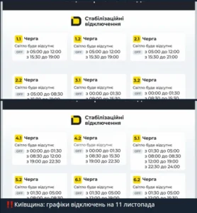 Новый режим отключений стал следствием массированного удара России 8 ноября, когда оккупанты одновременно атаковали дронами и ракетами «Кинжал» и «Калибр» энергетическую инфраструктуру Украины.