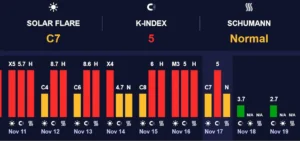 По оценке специалистов, 18 ноября К-индекс достигнет 4 баллов, что соответствует желтому уровню и классифицируется как небольшая магнитная буря. Такой показатель не представляет опасности для здоровых людей и не оказывает критического влияния на технику.