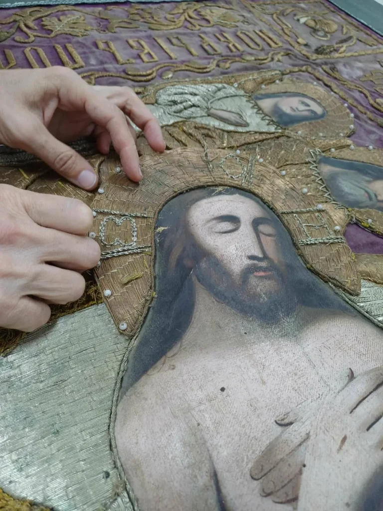 – Плащаница была в плохом состоянии, в частности, очень пострадал фон. Мы постепенно все восстанавливали. Живописную часть реставрировали вместе со студентами иконописного отделения семинарии. Теперь плащаница готова к тому, чтобы появиться в храме.