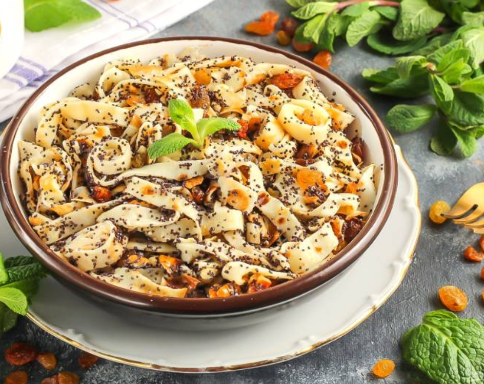 - Млинці згорнути в рулетик і нарізати смужками завширшки 5 мм. Викласти їх в глибоку миску, додати макову заправку і перемішати.