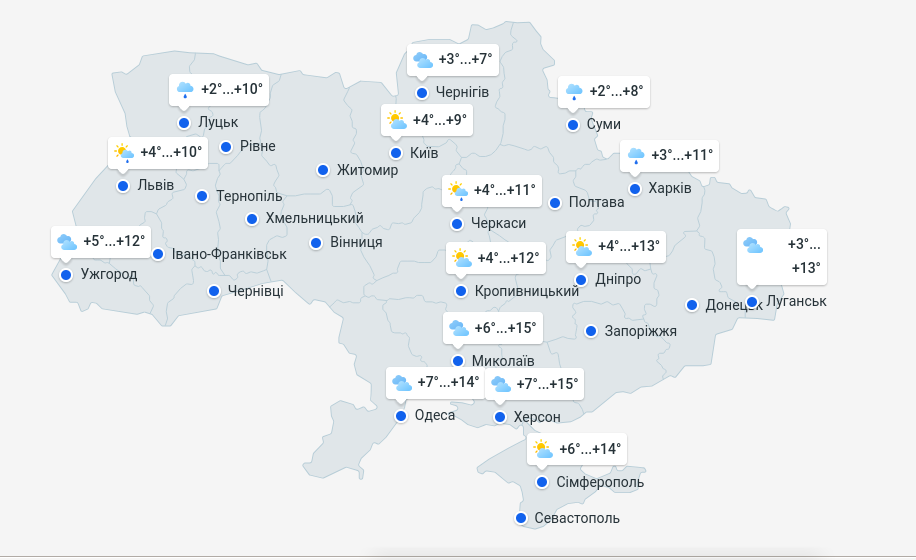 Сумська — Хмарно, поодинокі невеликі дощі вночі. Ніч +3…+6°С, денна +8…+11°С. Вітер західний 3–6 м/с.